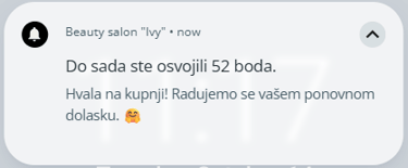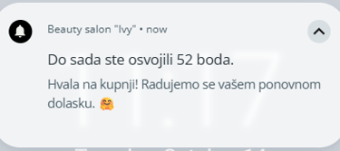 Automatske PUSH obavijesti s podacima o transakciji šalju se odmah u trenutku prodaje. Poruka klijenta informira o trenutnom statusu njihovih bodova i nagrada.
