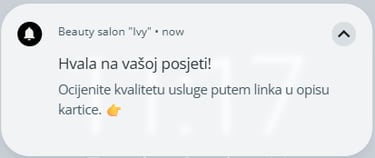 Automatska PUSH obavijest šalje se sat vremena nakon kupnje. Klijent je pozvan da ocijeni kvalitetu usluge ili ostavi recenziju .