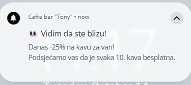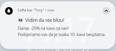 Automatski šaljite PUSH obavijesti svim klijentima s vašom loyalty karticom koji se nalaze unutar 100 metara od vaše lokacije.